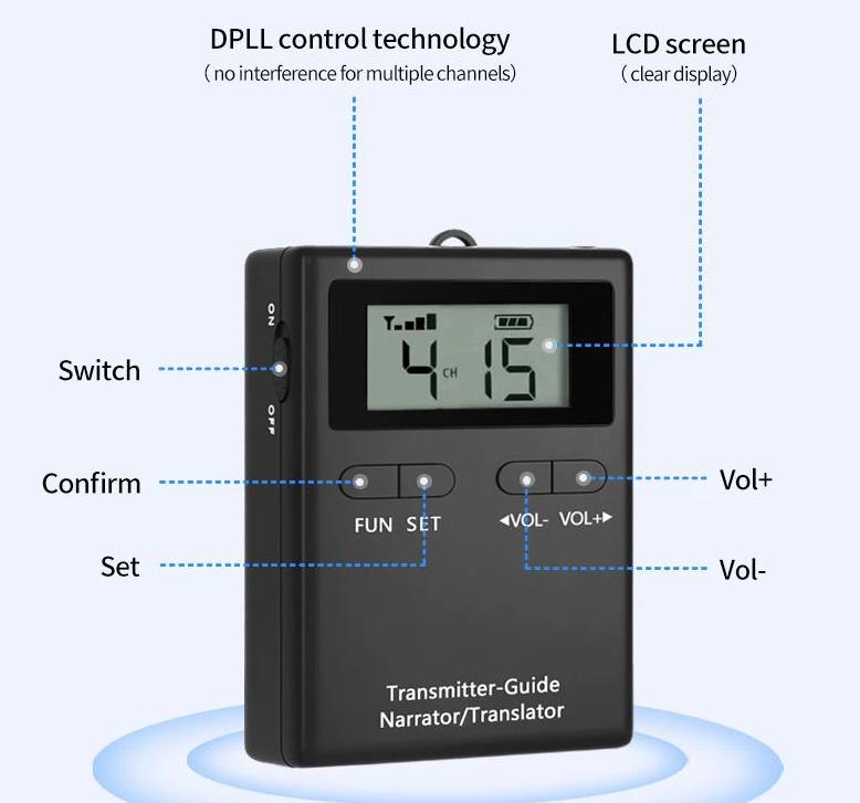 ระบบ Wireless Tour Guide ของเราใช้เทคโนโลยีการส่งไร้สาย UHF ที่ทันสมัย และชิปการเข้ารหัสที่ฉลาด เพื่อให้แน่ใจว่าการส่งเสียงที่ปลอดภัยและซื่อสูง ระบบมีช่องทางที่เลือกได้สูงสุด 99 ช่อง และไม่มีจํากัดจำนวนอุปกรณ์ที่สามารถเชื่อมต่อได้บนช่องทางเดียวกัน ทําให้เหมาะสำหรับเหตุการณ์ขนาดใหญ่และสภาพแวดล